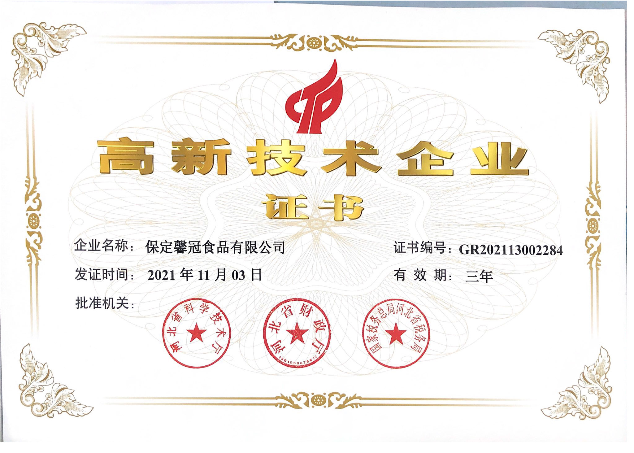 祝賀保定馨冠食品有限公司被評為“高新技術企業”