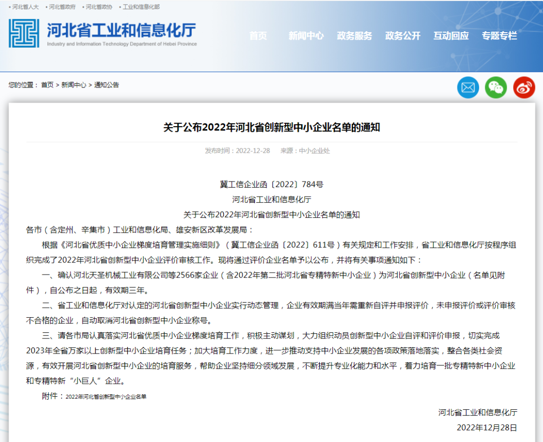 恭喜冠香居公司榮獲2022年河北省創新型中小企業!